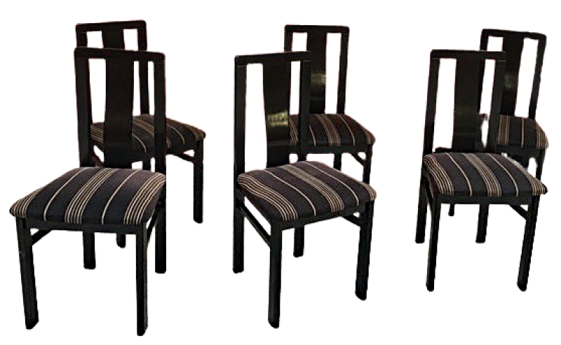 Decoene Freres, 6 chaises en bois noirci, circa 1960-1970 MOD 2036 DIMENSIONS EN CM Hauteur Largeur Profondeur Diamètre Hauteur assise Retour SaveSaveSaveEnregistrer