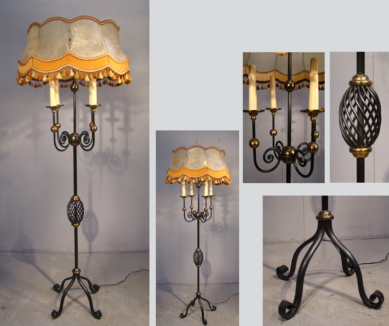 LAMPADAIRE EN FER FORGE LAQUE, BAGUES ET DECORATIONS EN LAITON VERS 1960