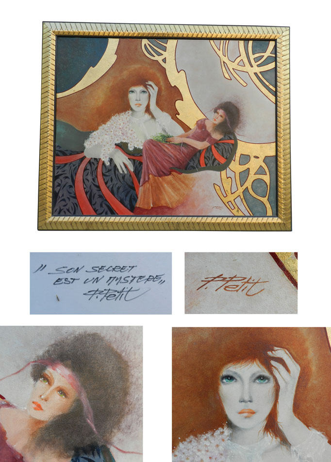 PIERRE PETIT , Huile sur toile : "Son secret est un mystère". Intitulée au dos. Signée. Dimensions : 80 cm x 100 cm.