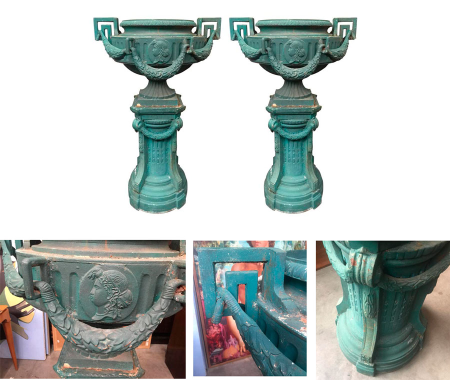 Vases à l'antique ornés de médaillons féminins, cannelures, anses à la grecques,