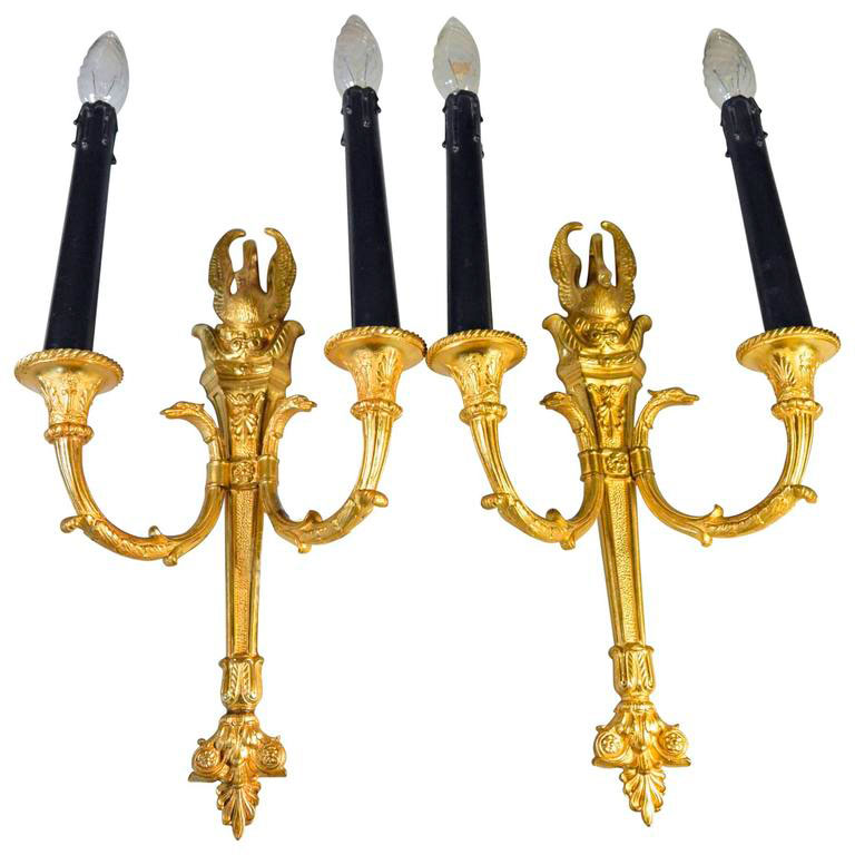 Paire d'appliques en bronze doré de style Empire vers 1950 INS 965 DIMENSIONS EN CM Hauteur 50 Longueur Largeur Diamètre Hauteur assise Retour page Déco Insolite Enregistrer