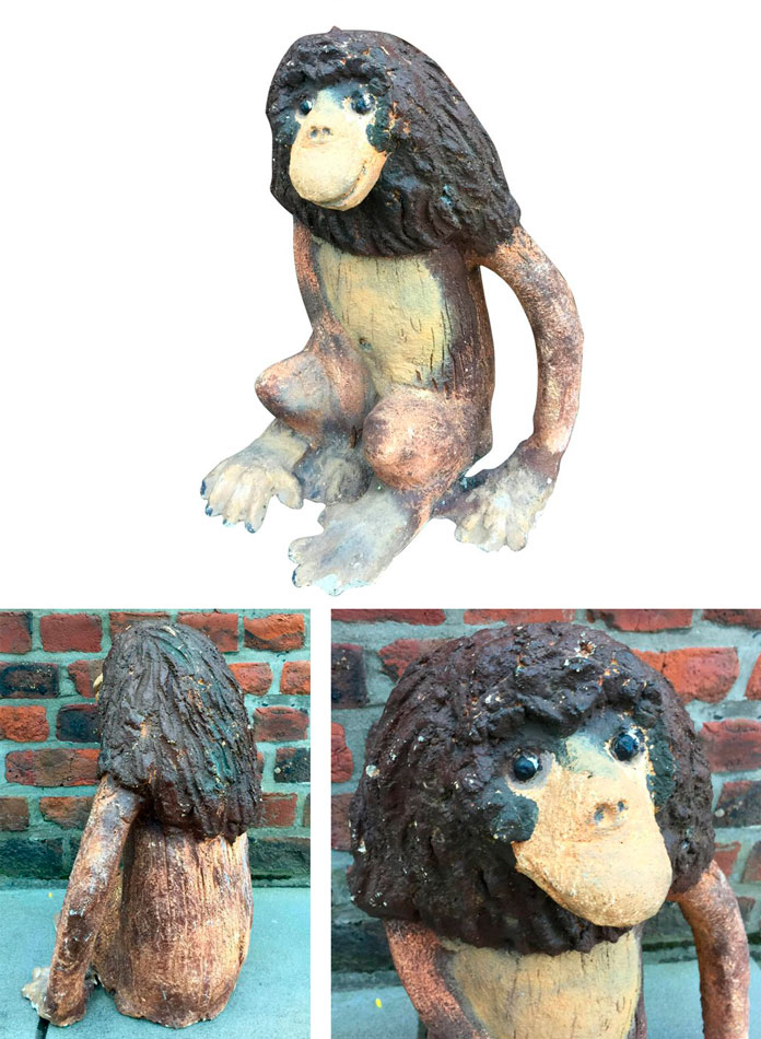 Singe polychrome en pierre reconstituée vers 1960 INS 1074 DIMENSIONS EN CM Hauteur 45 Largeur 30 Profondeur 30 Diamètre Hauteur assise Retour page Déco Insolite