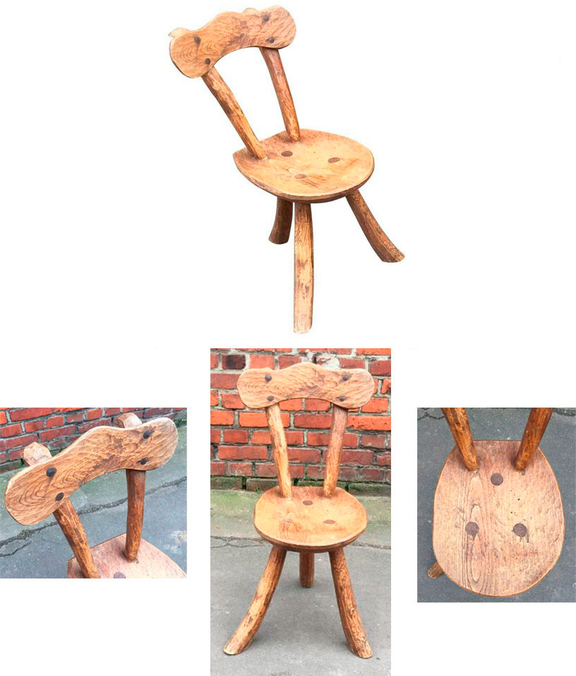 • INS 2016 Paire de chaises brutalistes en bois reposant sur un piètement tripode