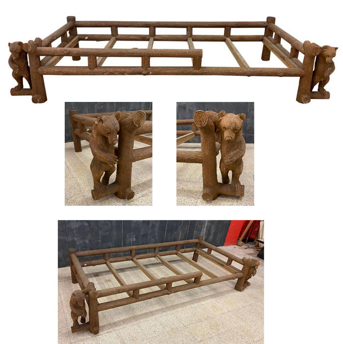 Lit En Bois Sculpté A Decors d'Ours Dans Le Style De La Forêt Noire