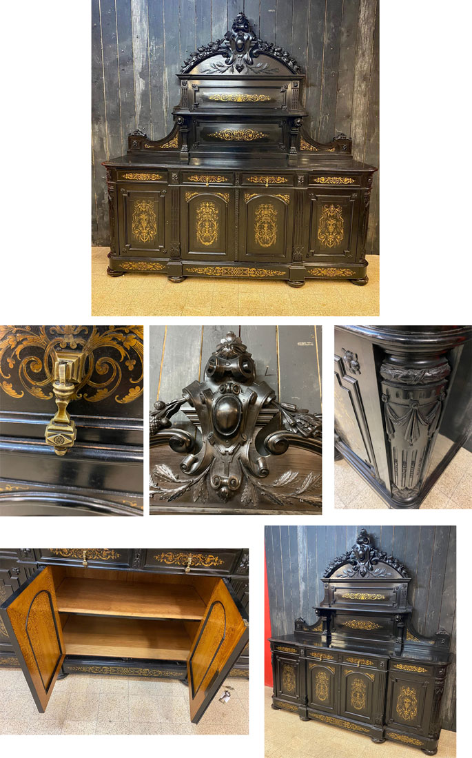 Desserte Epoque Napoléon III en poirier noirci, décors de laiton incrustés. INS 1606 DIMENSIONS EN CM Hauteur Largeur Profondeur Diamètre Hauteur assise Retour page Déco Insolite