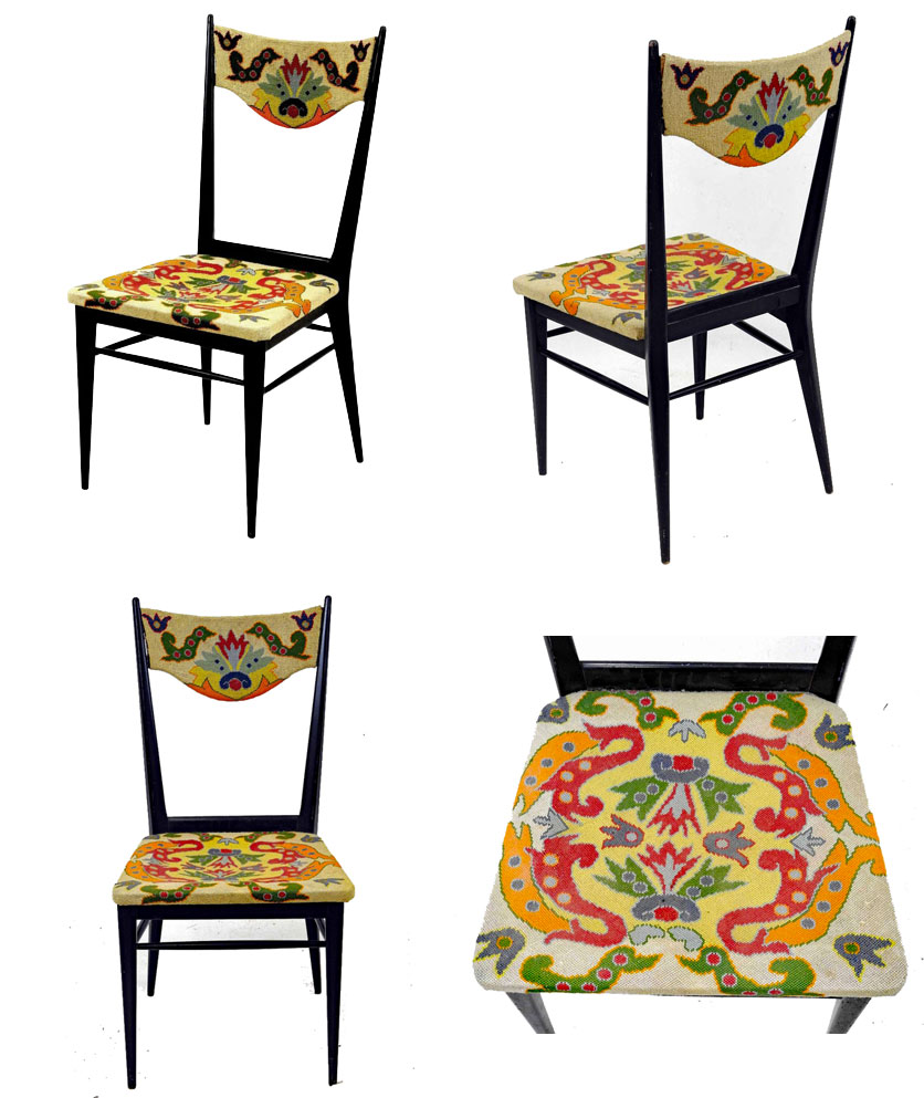 Chaise avec structure en bois ébénisé, assise et dossier recouverts de tapisserie petit point.