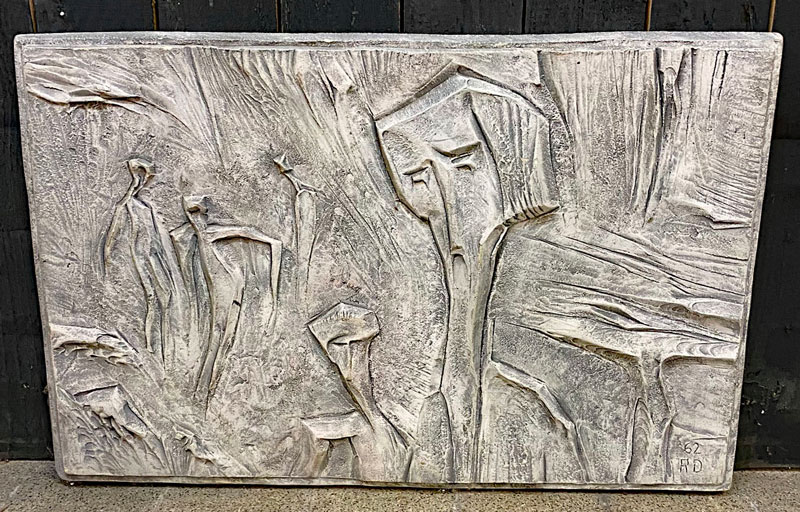Roger Desserprit sculpture en ciment monogrammée, signée et datée 1962 INS 1743 DIMENSIONS EN CM Hauteur 100 Largeur 104 Profondeur 3 Diamètre Hauteur assise Retour page Déco Insolite