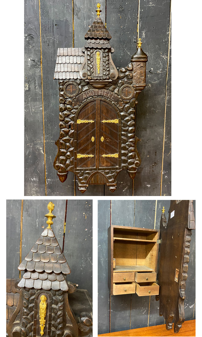 Curieuse armoire à pharmacie de style Forêt Noire en bois teinté, bronze et laiton.