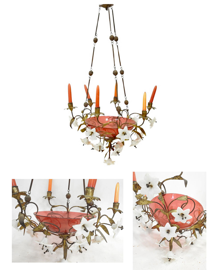 Lustre XIXème en bronze et verre teinté à 6 bras de lumière INS 1891 DIMENSIONS EN CM Hauteur 75 Largeur 50 Profondeur Diamètre Hauteur assise Retour page Déco Insolite