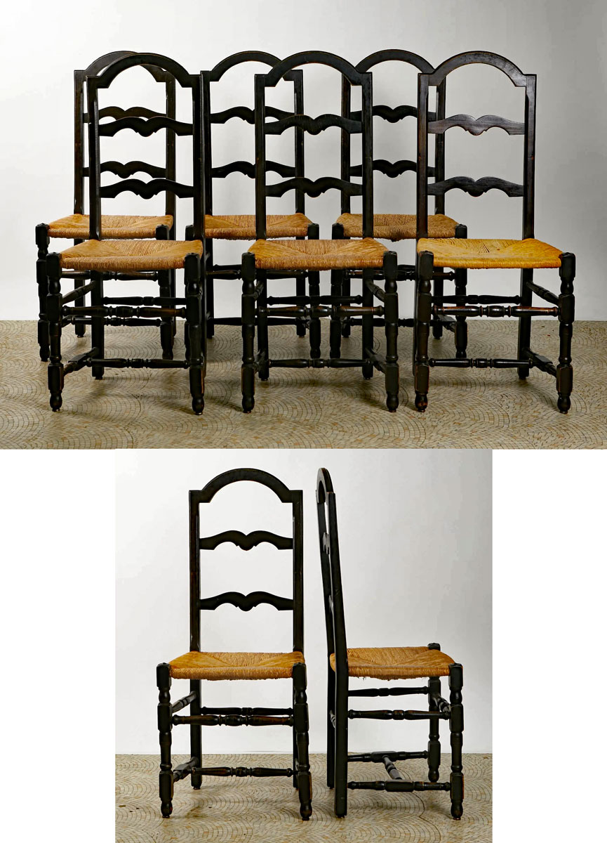INS 1953 Série de six chaises rustiques paillées à hauts dossiers