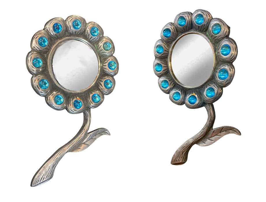 2 Petit Miroirs En Fonte Aluminium Et Pierres Bleues Circa 1970 INS 1971 DIMENSIONS EN CM Hauteur 27 Largeur Profondeur Diamètre 15 Hauteur assise Retour page Déco Insolite