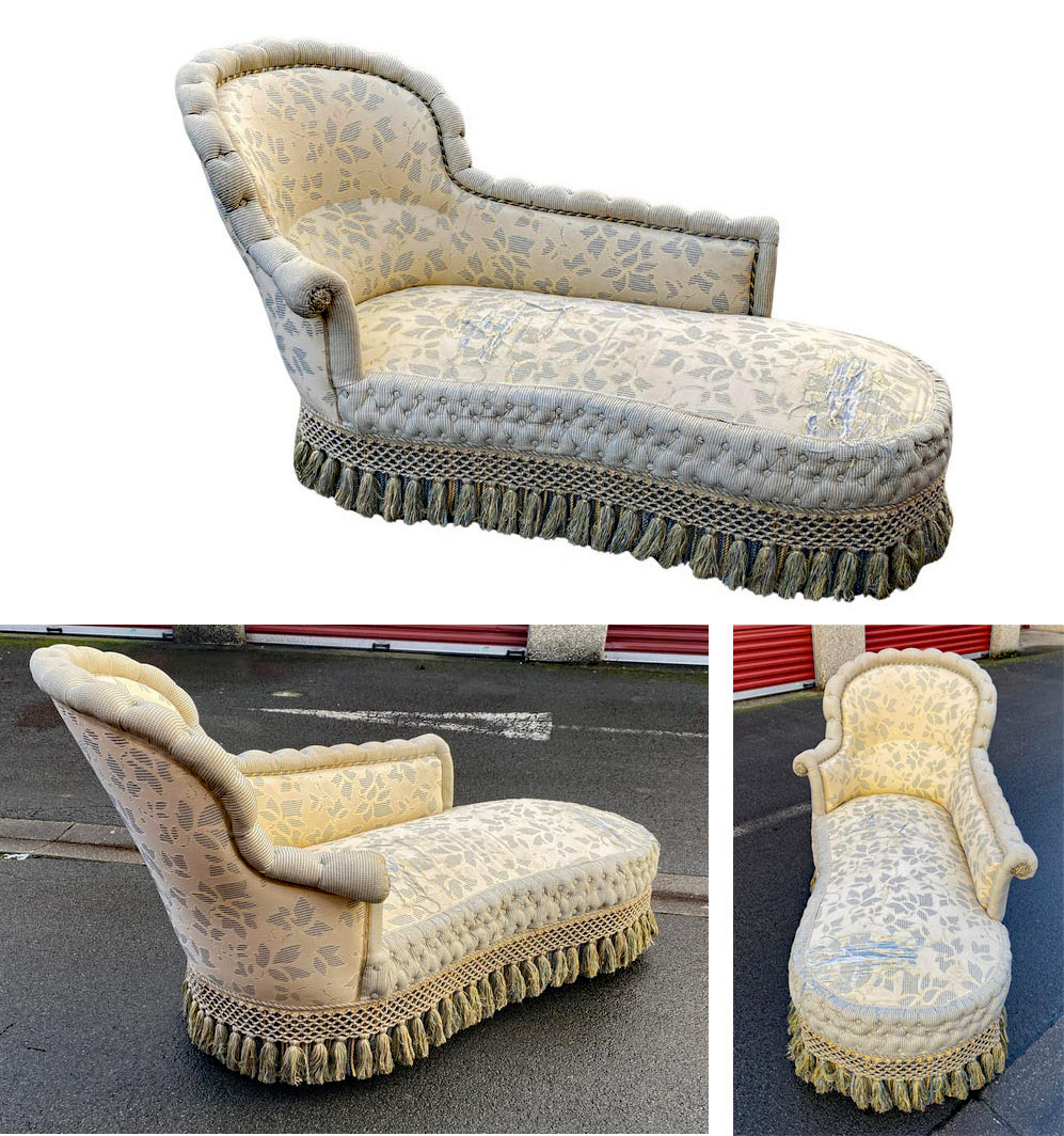 Méridienne NIII à garniture grise et blanche à motifs de feuillages, à bord capitonné,