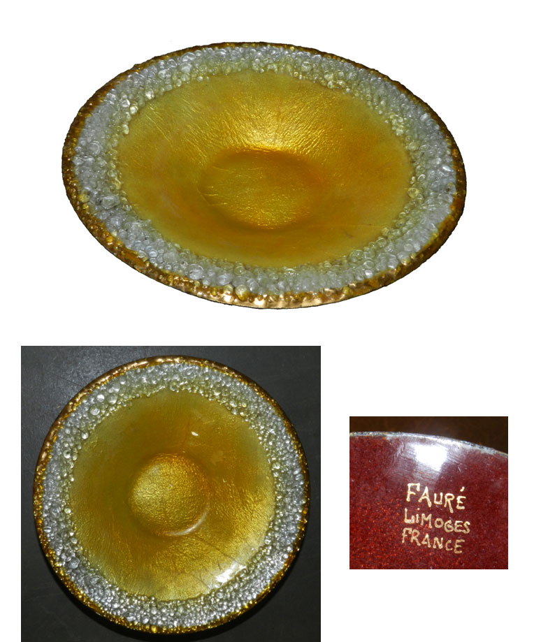 CAMILLE FAURE,EPOQUE ART DECO, PETIT PLAT EN EMAUX DE LIMOGES AD 766 DIMENSIONS EN CM Hauteur 3.5 Longueur Largeur Diamètre 18 Hauteur assise Retour page Art Déco