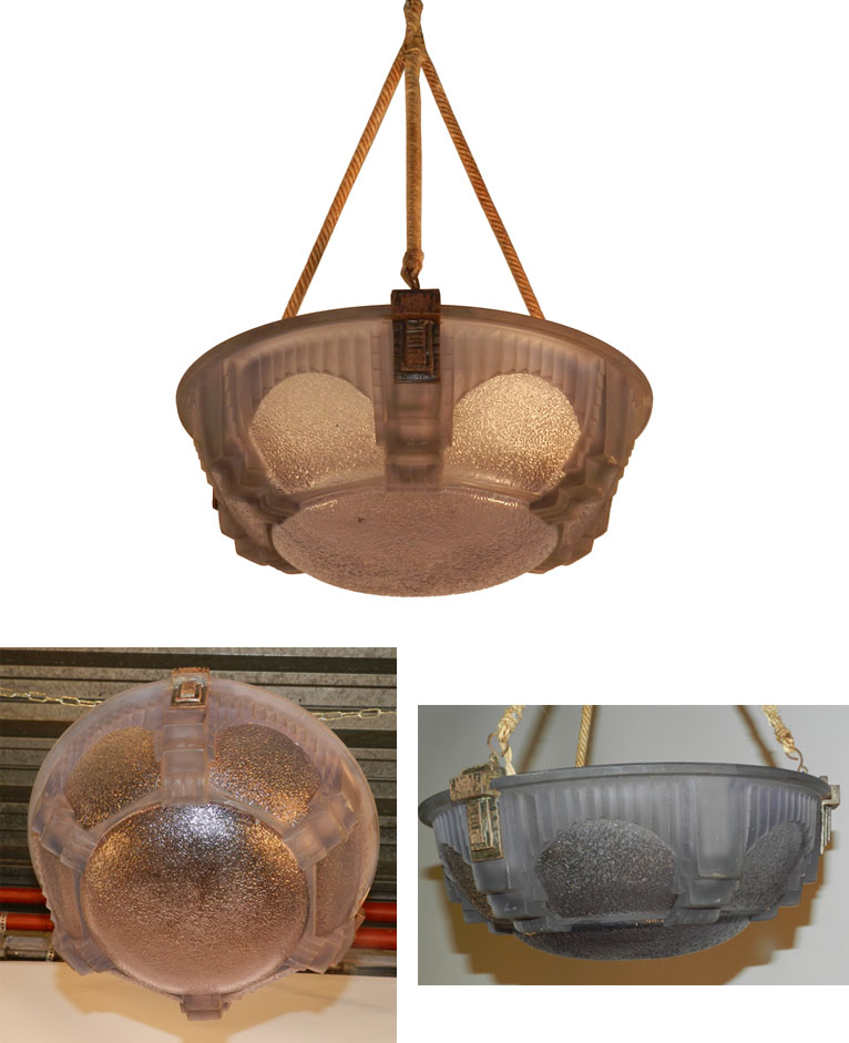 MULLER FRERES LUNEVILLE, VASQUE D'EPOQUE ART DECO EN VERRE MOULE TEINTE , ATTACHES EN FER MARTELE