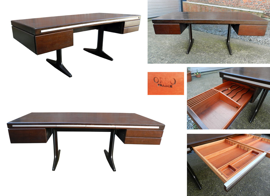 ORDO, BUREAU DESIGN EN BOIS TEINTE VERS 1980 , UNE ENFILADE AU MODELE EST EGALEMENT DISPONIBLE MOD 846 DIMENSIONS EN CM Hauteur 76 Longueur 90 Largeur 190 Diamètre Hauteur assise Retour
