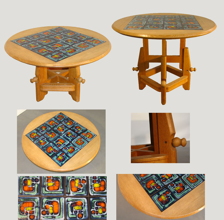 ROBERT GUILLERME ET JACQUES CHAMBRON, TABLE DE SALON MODELE LADISLAS  EN CHENE CIRE, CARREAUX CERAMIQUE