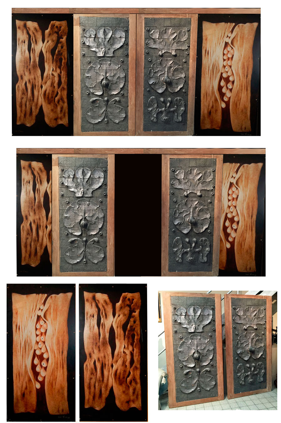 Yves Rhaye, L'éveil du printemps. Double porte en chêne sculpté  et céramique noire en relief, encadrée par deux peintures du même artiste.