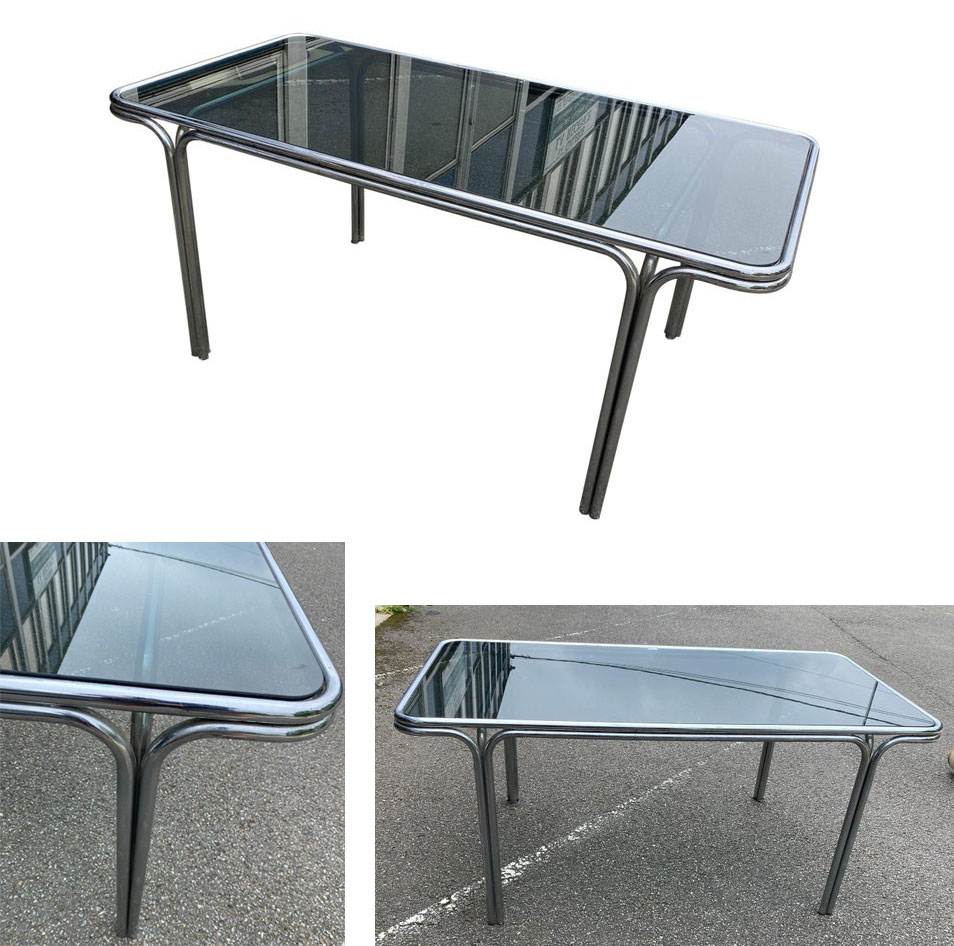 Table en métal chromé et verre teinté circa 1970. MOD 1432 DIMENSIONS EN CM Hauteur 72 Largeur 165 Profondeur 85 Diamètre Hauteur assise Retour SaveSaveSaveEnregistrer