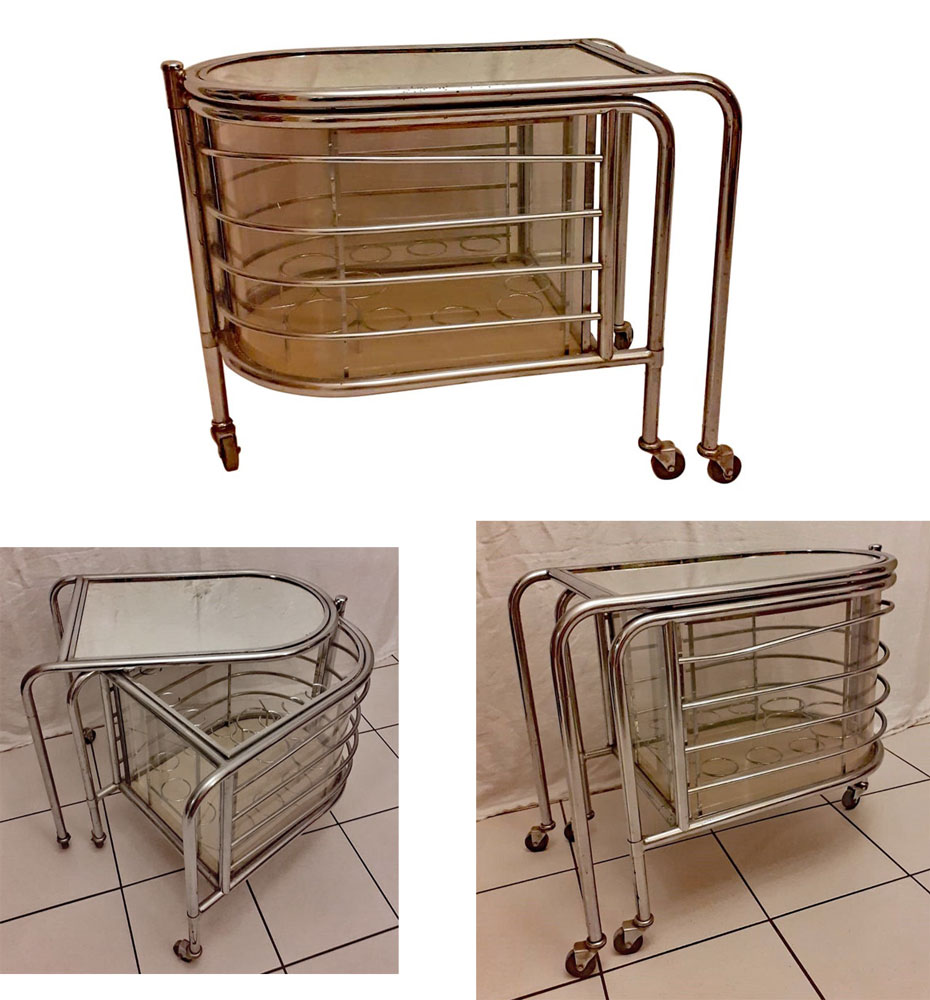 Louis Sognot, 1 original bar roulant en métal nickelé, époque Art Deco AD 1552 DIMENSIONS EN CM Hauteur 60 Largeur 70 Profondeur 40 Diamètre Hauteur assise Retour page Art Déco