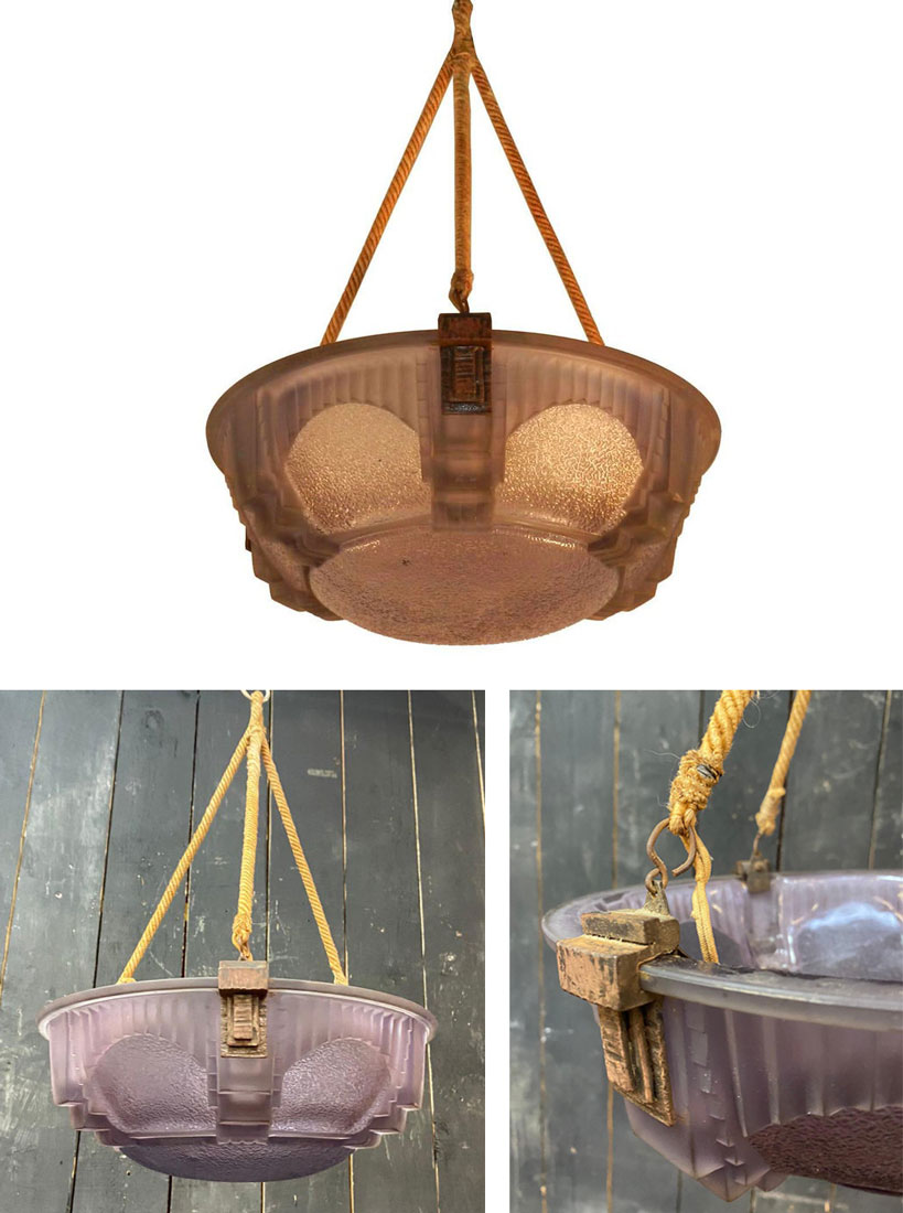 Muller Freres Luneville, lustre Art Déco en verre teinté et fer martelé.
