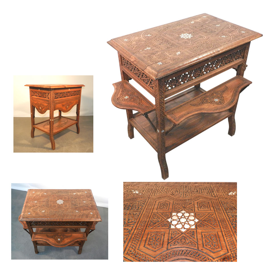 TABLE A THE SYRIENNE EPOQUE XIX EME, ENTIEREMENT RESTAUREE AD 459 DIMENSIONS EN CM Hauteur 75 Longueur 70 Largeur 45 Diamètre Hauteur assise Retour page Art Déco