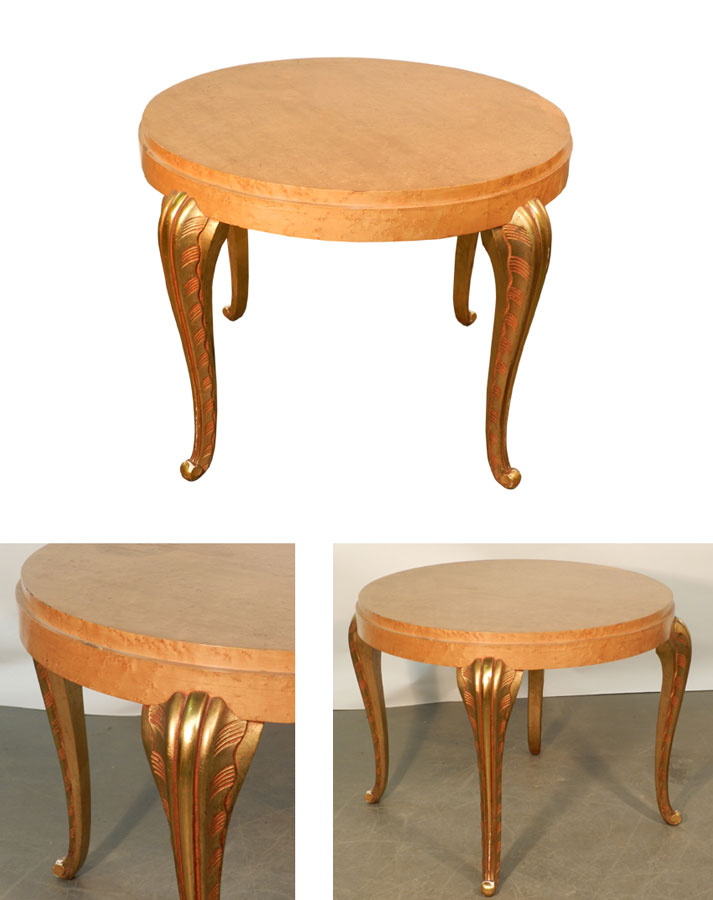 MAISON JANSEN, GUERIDON ART-DECO EN PLACAGE DE CITRONNIER ET BOIS DORE AD 5410 DIMENSIONS EN CM Hauteur 55 Longueur Largeur Diamètre 70 Hauteur assise Retour page Art Déco