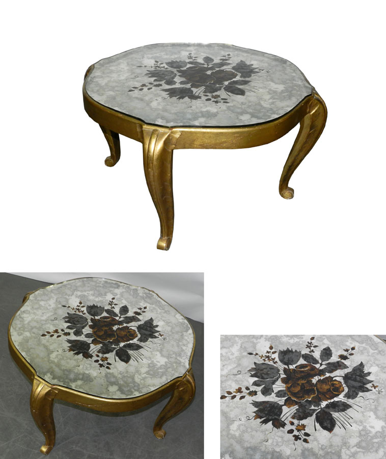 MAISON JANSEN, GUERIDON EN BOIS DORE, PLATEAU EN MIROIR GRAVE POLYCHROME AD 645 DIMENSIONS EN CM Hauteur 45 Longueur Largeur Diamètre 85 Hauteur assise Retour page Art Déco