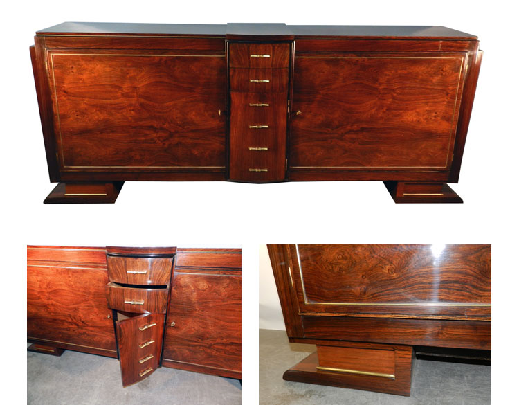 AD 776 TRAVAIL FRANCAIS 1930, ENFILADE ART-DECO EN PLACAGE DE PALISSANDRE ET LAITON, ENTIEREMENT RESTAUREE, VERNIS TAMPON.