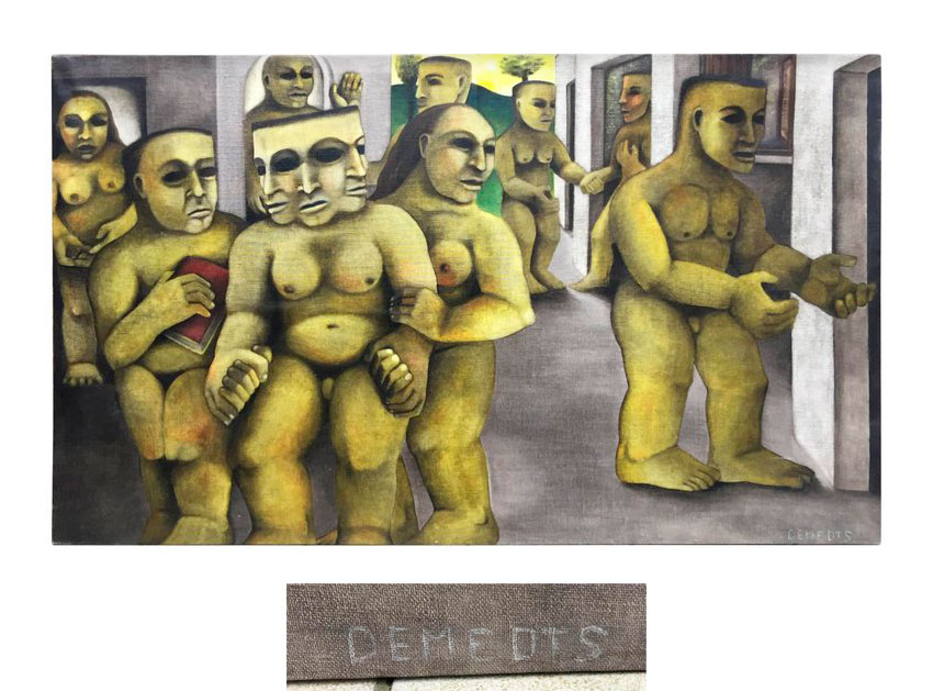 Michèle DEMEDTS (1958-), huile sur toile signée DEMEDTS, Belgique circa 1980. AD 1064 DIMENSIONS EN CM Hauteur 121 Longueur Largeur 205 Diamètre Hauteur assise Retour page Art Déco