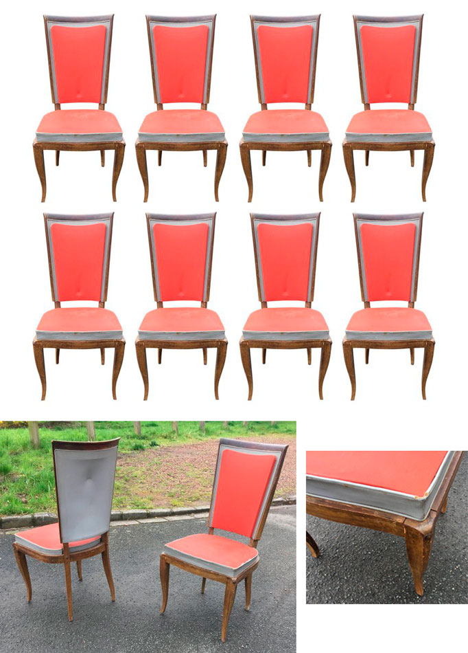 Série de 8 chaises en hêtre et skaï vers 1930. AD 1081 DIMENSIONS EN CM Hauteur Largeur Profondeur Diamètre Hauteur assise Retour page Art Déco