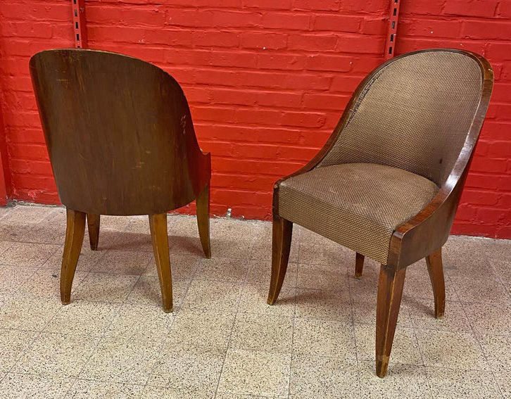 6 grandes chaises à dossier gondole en placage de palissandre vers 1930 AD 1383 DIMENSIONS EN CM Hauteur Largeur Profondeur Diamètre Hauteur assise Retour page Art Déco