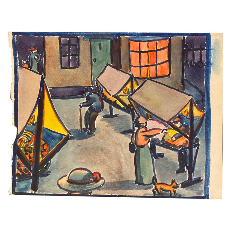 Loïs Hutton (1893-1972) "Jour de marché" Gouache sur papier, datée au dos 1919.