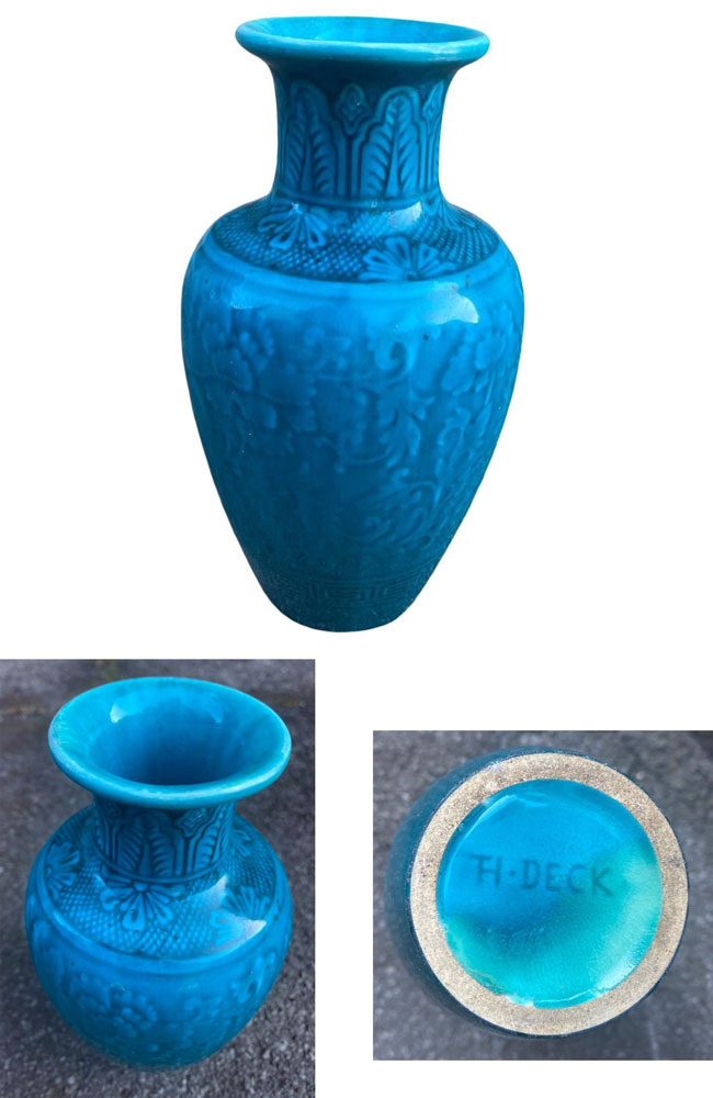 Theodore Deck (1823-1891) vase en céramique signé, circa 1870 AD 1547 DIMENSIONS EN CM Hauteur 18 Largeur Profondeur Diamètre 10 Hauteur assise Retour page Art Déco