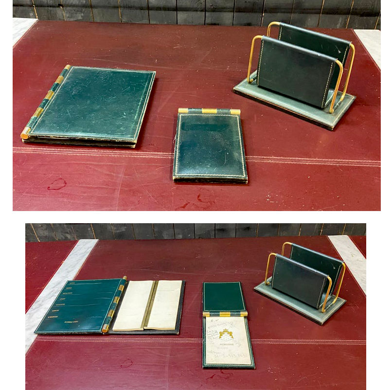 Jacques Adnet, nécessaire de bureau en cuir circa 1940. AD 1661 DIMENSIONS EN CM Hauteur Largeur Profondeur Diamètre Hauteur assise Retour page Art Déco
