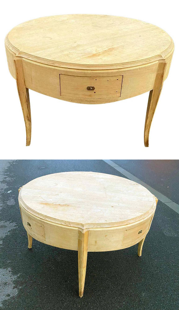 Grand guéridon art déco en bois brut ouvrant à 4 tiroirs en ceinture AD 1728 DIMENSIONS EN CM Hauteur Largeur Profondeur Diamètre Hauteur assise Retour page Art Déco