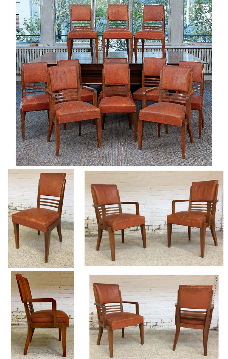 Suite de 9 chaises et 2 fauteuils Art Deco en acajou et cuir circa 1940