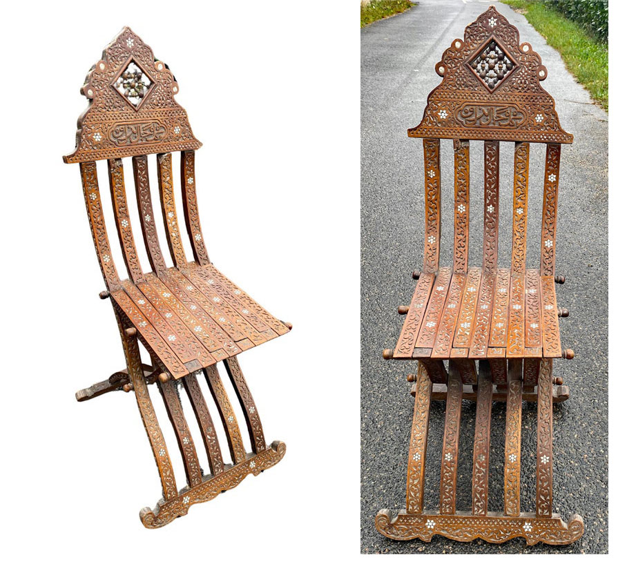 Travail oriental. Fauteuil en bois sculpté, incrustation d'os et de nacre vers 1880 AD 1823 DIMENSIONS EN CM Hauteur 100 Largeur 45 Profondeur 46 Diamètre Hauteur assise 48 Retour page Art Déco