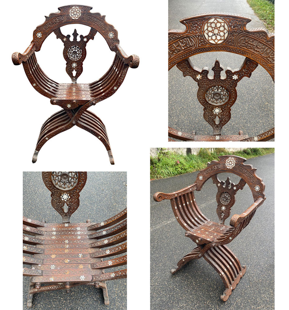 AD 1824 Travail oriental. Fauteuil en bois sculpté, incrustation d'os et de nacre vers 1880