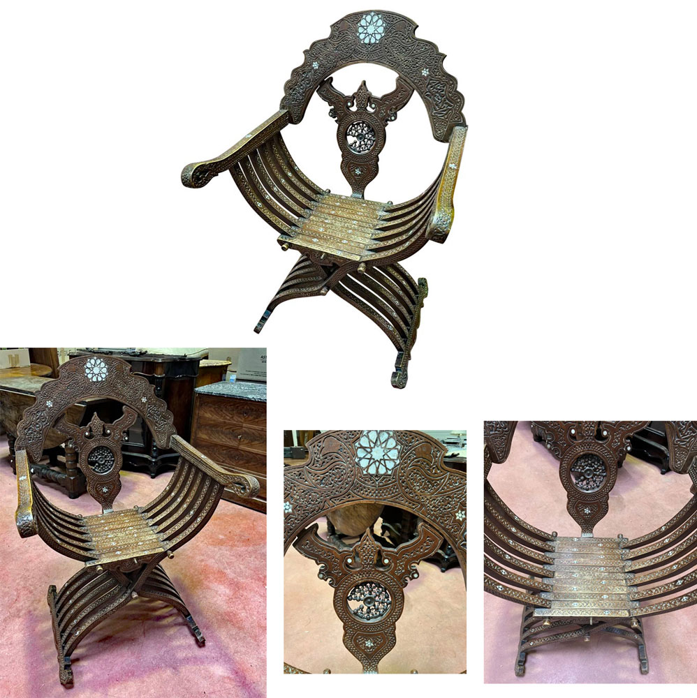 Travail oriental. Fauteuil en bois sculpté, incrustation d'os et de nacre vers 1880 AD 1903 DIMENSIONS EN CM Hauteur 105 Largeur 60 Profondeur 68 Diamètre Hauteur assise Retour page Art Déco