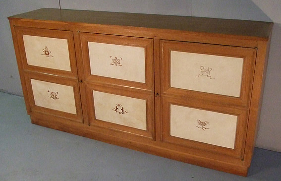 MOTTE, PARIS, ENSEMBLE DE TROIS MEUBLES D'EPOQUE ART-DECO EN CHENE, PLACAGE DE CHENE ET PANNEAUX RECOUVERTS DE PARCHEMIN DECORE, VERS 1940. PEUVENT ETRE SEPARES.