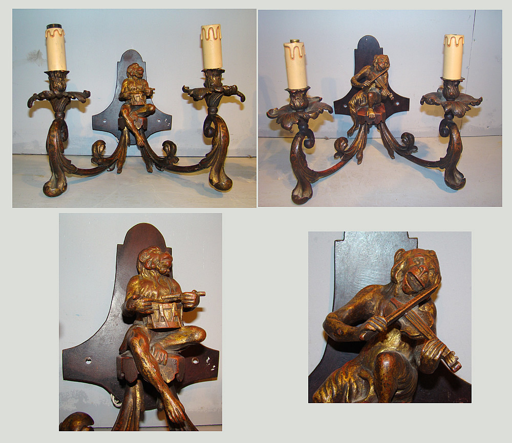 AD 1100 BAGUES Paire d'appliques aux singes musiciens, bronze et métal laqué, vers 1940