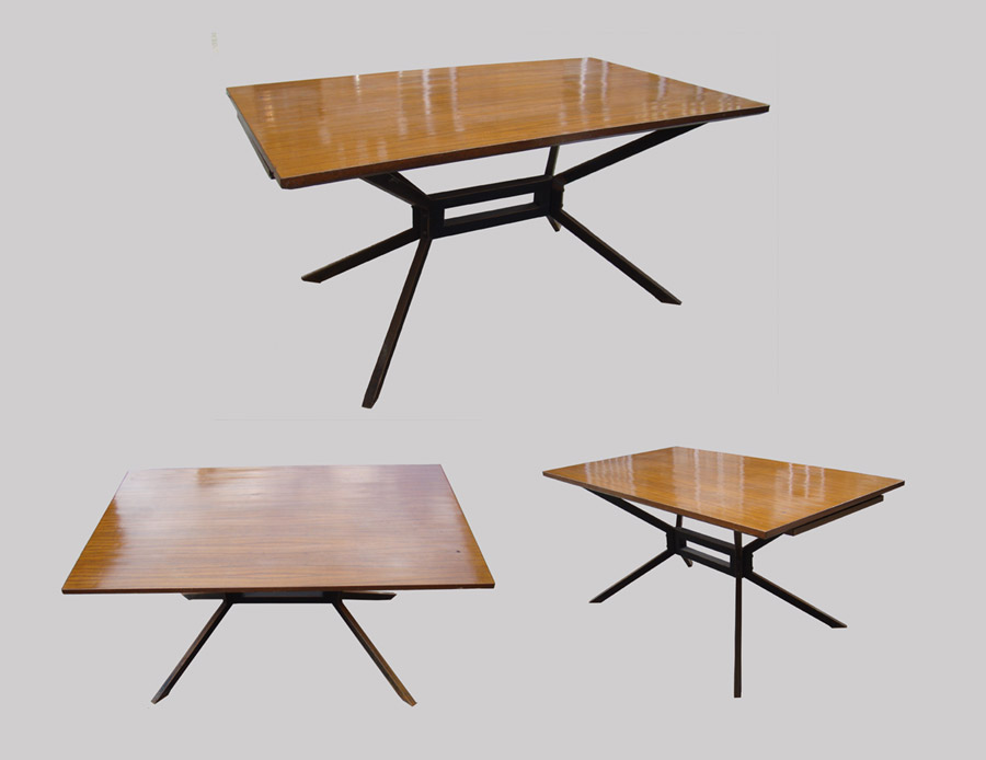 TRAVAIL FRANCAIS , TABLE T 129 A PIETEMENT EN METAL LAQUE,PLATEAU+ 2 ALLONGES PLAQUE PALISSANDRE, EDITION ROZIERS 1961