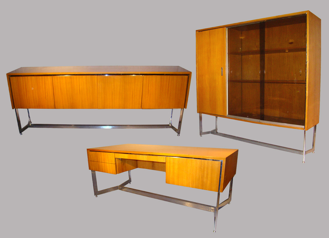 ENSEMBLE DE BUREAU 1970 EN PLACAGE DE MERISIER ET METAL CHROME, COMPOSE DE 2 ELEMENTS POUVANT ETRE SEPARES ( enfilade vendue)