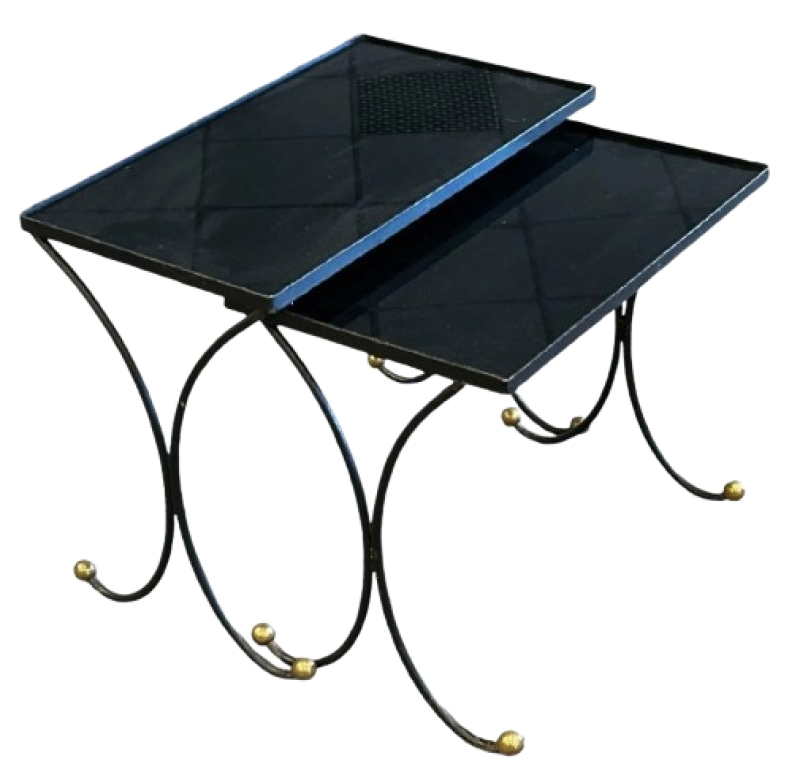 Deux tables gigognes en fer forgé et laiton circa 1950/1960 MOD 2044 DIMENSIONS EN CM Hauteur 44 Largeur 54 Profondeur 30 Diamètre Hauteur assise Retour SaveSaveSaveEnregistrer