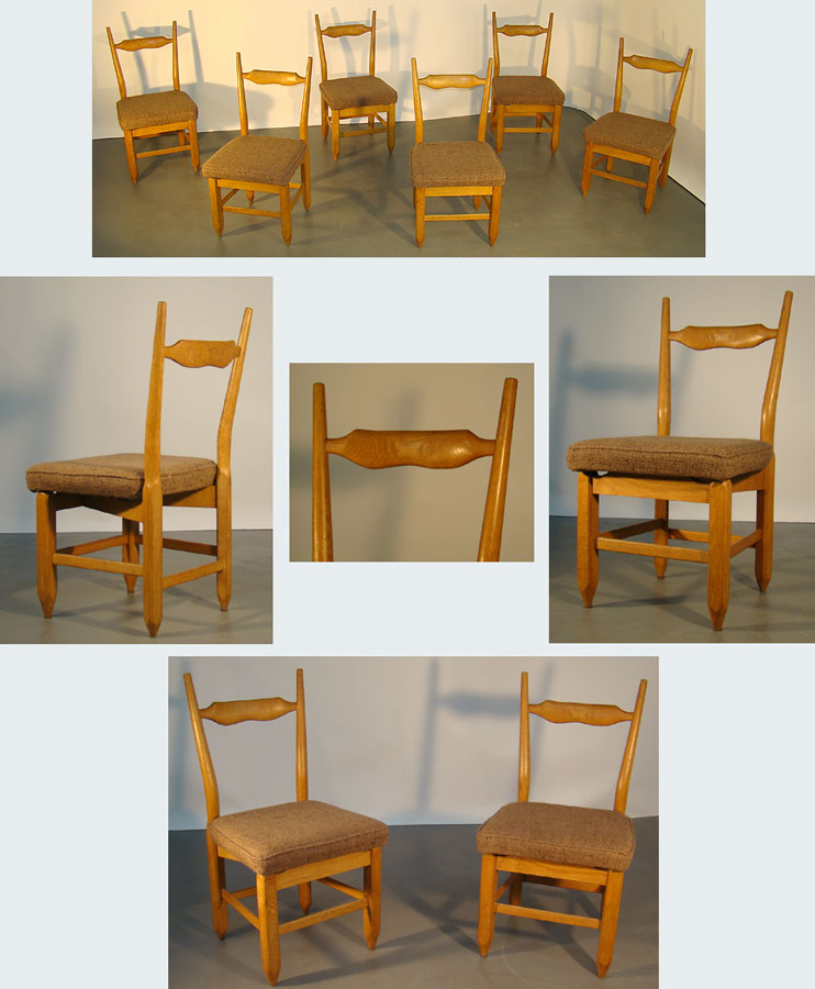 GUILLERME ET CHAMBRON, SUITE DE 6 CHAISES " CHARLES"EN CHENE MASSIF , TISSU EN LAINE, EDITION "VOTRE MAISON" 1960