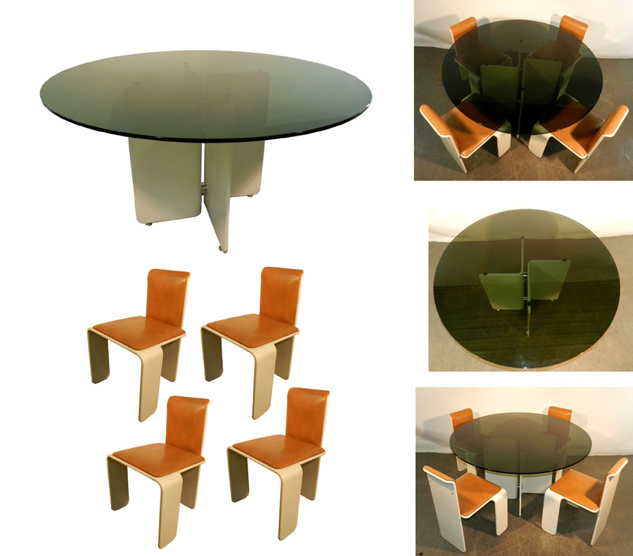 ENSEMBLE DE SALLE A MANGER 1960/1970 EN BOIS LAQUE ET METAL CHROME, PLATEAU DE LA TABLE NE VERRE TEINTE VERT,