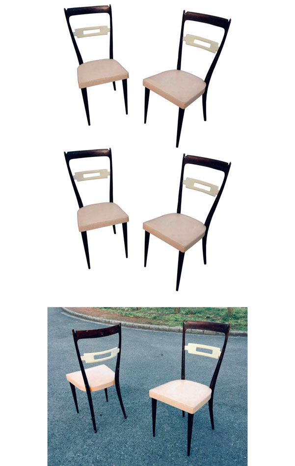 Consorzio Sedie Friuli, série de 4 chaises en hêtre teinté et laqué et skaï.