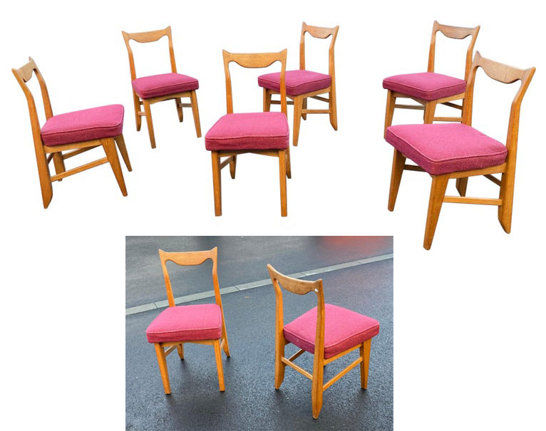 ROBERT GUILLERME ET JACQUES CHAMBRON, série de 6 chaises en chêne. Edition Votre Maison 1970 MOD 1474 DIMENSIONS EN CM Hauteur 89 Largeur 46 Profondeur 46 Diamètre Hauteur assise 50 Retour SaveSaveSaveEnregistrer