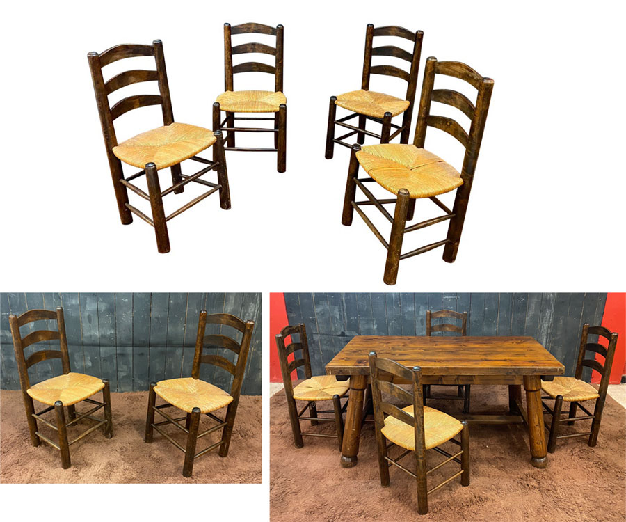 4 chaises brutalistes en pin, circa 1950 MOD 1675 DIMENSIONS EN CM Hauteur 89 Largeur 45 Profondeur 40 Diamètre Hauteur assise 45 Retour SaveSaveSaveEnregistrer