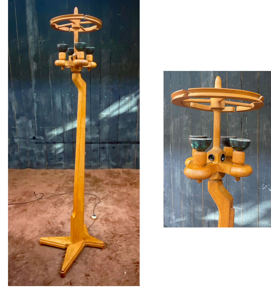 Guillerme et Chambron, Lampadaire en chêne et céramique. Edition Votre Maison circa 1970.